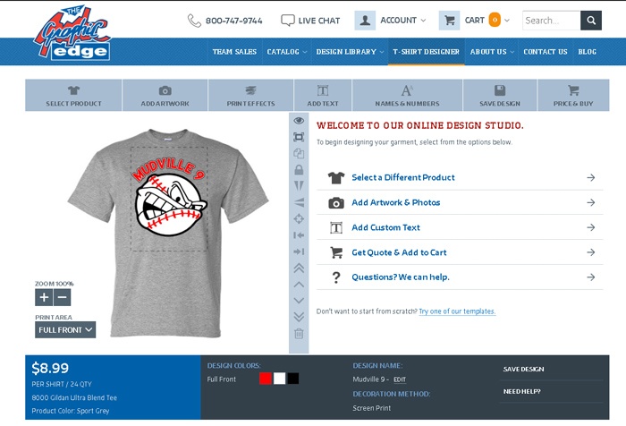 The real time pricing feature show you exactly how much your custom t-shirt will cost if you buy 24 pieces. Use the “Price and Buy” tab to calculate the cost for fewer or more shirts.
